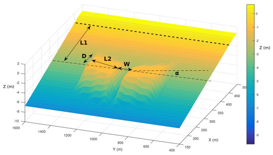 The model is then used in a series of 2D configurations to explore the hydrodynamical functioning of complete artificial breakwater–lagoon systems. The reference computational domain is 500 and 2000 m long in cross- and alongshore directions, respectively, with 10-m uniform horizontal resolution. The base bathymetry is an along-shore uniform linear slope (), with bed elevation ranging from to 1 m from offshore to beach boundaries. Note that the domain is extended in cross-shore direction in Section 3.2.2 in order to simulate case of breakwaters further offshore. A range of synthetic breakwaters is imposed over this base bathymetry; all of which are made of two symmetric wings separated by a pass. The geometrical parameters are defined as follows (see Figure 2).