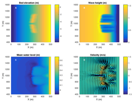 Reference case hydrodynamics. (A) Bed elevation. (B) Wave height. (C) Mean water level. (D) Contour of cross-shore velocity and velocity vectors field (only one fourth of the computational points are shown). Positive velocity correspond to onshore directed flow.