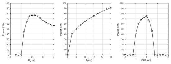 Effect of wave height, period and still water level on power production for Opti1 case.