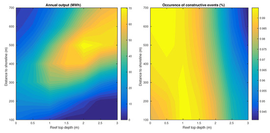 The complete calculation is thus performed for a range of reef top depth H from 0 to 3 m with 0.5 m steps and distance to shoreline from 100 to 700 m with steps of 50 m. The total number of simulated cases is thus 1225. The results are depicted in Figure 7, left. The annual energy production strongly depends non-monotonically on both reef top depth and distance to the shoreline. The maximal output for the selected wave climate is obtained for H and values of approximately 2 and 500 m, respectively. It reaches 70 MWh, but can drastically be reduced when varying the breakwater location and/or depth.