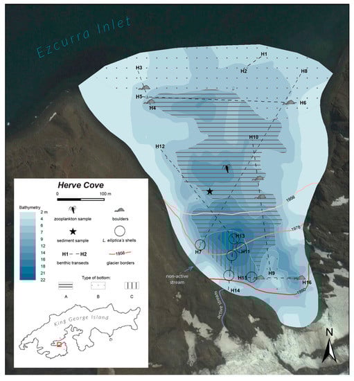The research was conducted in 2008 (benthic survey) and 2009 (plankton sampling) in Herve Cove (Figure 1), which is located in the southern part of the Ezcurra Inlet, in the western branch of Admiralty Bay, King George Island (South Shetlands Islands, Antarctica). It is a small periglacial lagoon, typical for the shoreline of this area, and partially isolated from the Ezcurra Inlet by the submerged moraine []. The cove was created as a result of a gradual retreat of Dera Icefall [].