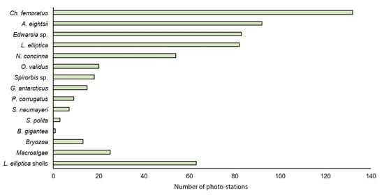 A total of 13 benthic taxa (11 identified species) from seven phyla were observed in Herve Cove. Amphipoda (except Cheirimedon femoratus and Bovallia gigantea), Polychaeta (except Spirorbis sp.) and Bryozoa specimens were identified up to the family/species level (Table 2). Bottom fauna were dominated by mobile organisms, such as the amphipods Ch. femoratus and limpets Nacella concinna, and sessile organisms, such as sea anemones Edwardsia sp., bivalves Aequiyoldia eightsii (previously Yoldia eightsii) and Laternula elliptica (Figure 2). Individuals of Ch. femoratus were noted at 132 photo stations, while A. eightsii at 54, Edwardsia sp. at 48 and L. elliptica at 47. The number of species at each photo station ranged from 0 to 8.