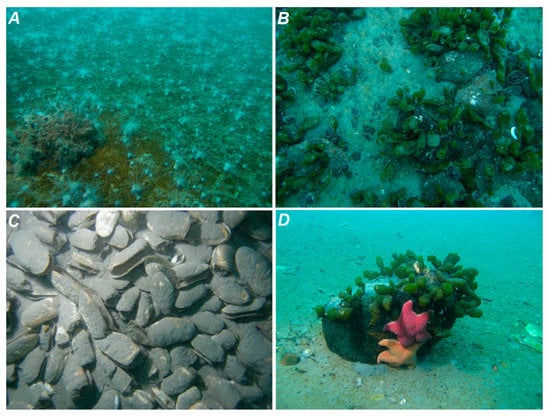 Benthic assemblages recognized in Herve Cove. (A) Soft bottom, (B) Hard bottom, (C) Soft bottom close to glacier stream, (D) Boulders (in text recognized as B1).