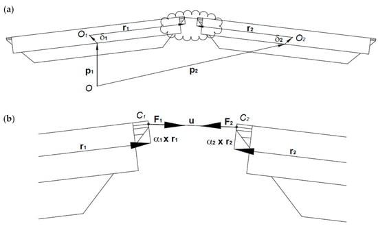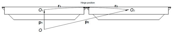 At some instant of time, the breakwaters will be moved by waves so that the position of the connection points will change. Figure 2 shows the relative position of the connection points denoted by the vector . The translational and rotational displacements of the first breakwater are given by vectors δ1 and , respectively. The denotations and are related to the second breakwater. By the vector analysis and by Figure 2 the following expression is obtained