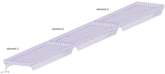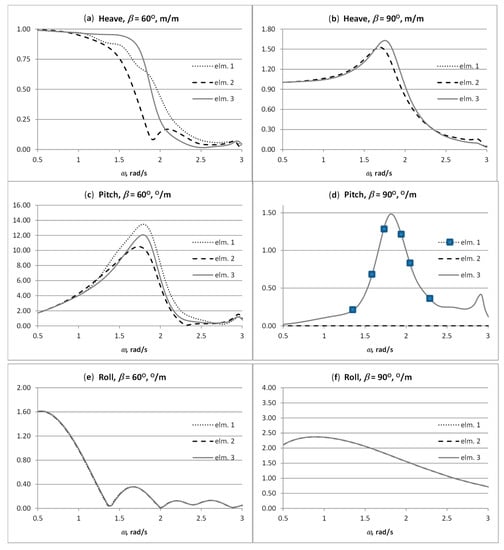 The panel model of the breakwaters is presented in Figure 3. In the first step, the hydrodynamic reactions (added mass and radiation damping) are evaluated, as well as the linear transfer function (LTF) for the first order wave forces. In the next step, the response amplitude operators (RAOs) for each of the three breakwaters are calculated. The viscous damping is set to 5% of the critical damping for the roll motions. In this step, the newly developed additional stiffness matrix, given by Equation (13), is used for each connection as part of the input for the HydroStar. Between neighboring breakwaters, two connections are modeled, so that the overall number of connections is four in two hinges. The value of the connection stiffness k is chosen to be 108 N/m, see Figure 2, which is approximately 100 times higher than the value of the hydrostatic stiffness for heave of one breakwater. The obtained RAOs are presented in Figure 4. Each graph contains results for all three elements of the breakwater array in relation to the incoming wave direction. Exact position of the elements is shown in Figure 3. Graphical representation of the incoming wave direction can be found in Figure 5. The mooring lines are omitted for the sake of simplicity. In general, a mooring system is used for position keeping of floating breakwaters. It is not intended to influence the first order motions. In this study one of the main concerns are the first order motions of the breakwaters. The same approach for calculation RAOs of floating breakwaters without mooring lines can be found in reference [6].