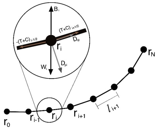 The right-hand side of Equation (2) are the contributions of internal forces and external forces. Line numerical damping is a function of strain rate and damping coefficient. Tension is calculated as a function of segment strain and Young modulus of the line. Net weight is calculated based on the segment’s dry weight and buoyancy. These are the internal forces. As for the external forces, and are transverse and tangential hydrodynamic drag forces modelled using the Morison Equation. Vertical bottom contact is modelled by a spring-damper system. The forces are illustrated in Figure 4. For additional details on how the aforementioned forces are modelled, the reader is referred to Reference [].