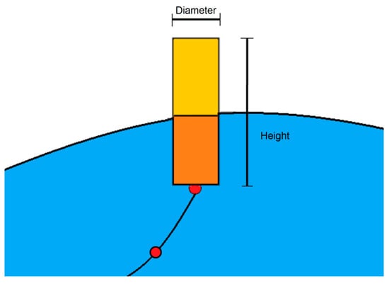 The buoy is modelled as a cylinder and an extension to a connection node with additional properties of cylinder height, diameter and mass. The submerged volume of the buoy (orange colour in Figure 5) is calculated based on the free surface calculated at the exact position of the node. Wet volume fraction is calculated as the ratio of the submerged volume and the total volume of the cylinder. Buoyancy is then calculated using the total volume and the newly calculated wet volume fraction. The drag force is calculated through Morison Equation again by taking into account the total projected area, multiplied by the wet volume fraction calculated before.