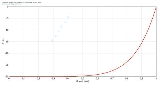 Current is implemented as a uniform velocity field over the whole simulation domain. Both in OrcaFlex and adapted MoorDyn, a vertical distribution of the current velocity in three dimensions can be implemented according to the power law: