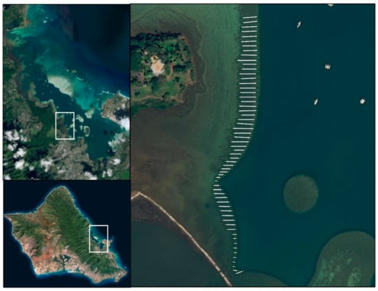 Coral reefs in Kāneʻohe Bay, located on the northeast side of Oʻahu, Hawaiʻi (21°4′ N and 157°8′ W), have some of the highest levels of coral cover (54–68% compared to statewide average of 24.1%) across the Hawaiian islands [,,]. Due to the unique geographic properties of Kāneʻohe Bay, these reefs experience elevated summer water temperatures (1–2 °C), which offshore reefs will not be subjected to for several years [].