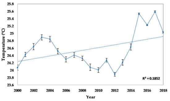 Average annual daily mean seawater temperature (°C) at Moku o Loʻe (Coconut Island) at the Hawaiʻi Institute of Marine Biology from 2000–2018. Data retrieved from (http://www.pacioos.hawaii.edu/weather/obs-mokuoloe/).
