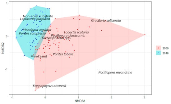 Non-metric multidimensional scaling (NMDS) ordination plot representing the benthic communities from the 2000 and 2018 surveys in convex hulls (Dimensions = 2, Stress = 0.19). Each point represents one transect (n = 60).