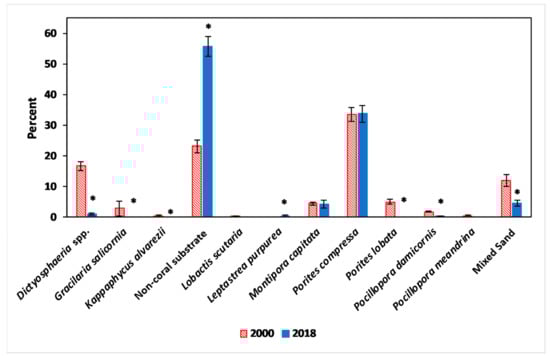 Mean Percent cover of each species or category in 2000 vs. 2018. Each standard error bar is one standard error from the mean. * Indicates significant difference between years at p < 0.05.