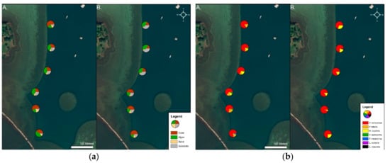Spatial trends in (a) Total benthic cover and (b) coral species composition. (A.) represents data from the 2000 survey and (B.) represents data from the 2018 survey. Each pie chart represents the average from 10 transects in that section. Photo credit: Digital Globe