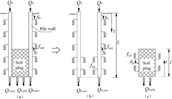 As soil plug is a major factor that affects the development of bearing capacity of open-ended pipe piles, with the interactions between the soil plug and pile annulus being crucial. In order to simplify the calculations, the effect of the pile annulus and internal soil plug was considered separately. The open-ended pipe pile was defined as a kind of “pile-in-pile” system, i.e., the pile annulus as the “outer pile” (Figure 1b) and the soil plug as the “inner pile” (Figure 1c). Thus, the pile annulus and soil plug can be analyzed separately. At the same time, they experienced interactive coupling and together constrained the development of the bearing capacity of the pipe pile. The external skin frictional resistance of the inner pile (soil plug) was the internal skin friction of the outer pile (pile annulus).