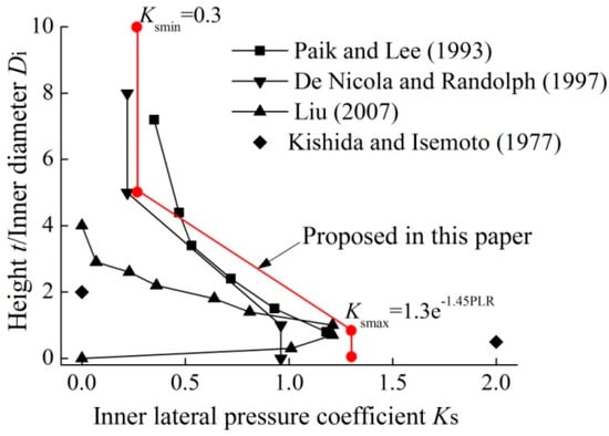 De Nicola and Randolph [] suggested that for sandy soil, Ksmax can be expressed as a function of soil relative density Dr (in %), i.e., Ksmax = Dr/100. Lehane and Gavin [] showed in their research that Ksmax can be as high as 1.3, and Ksmin as low as 0.3. The latter is the value for Ksmin in our computation, but Ksmax is not a constant and is related closely to the plug length ratio (PLR) [], as expressed in the exponential function below: