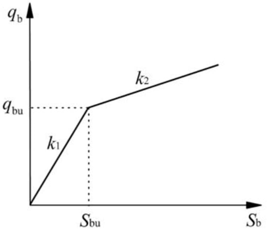 where qb is the unit vertical stress at pile end(Pa); k1 and k2 are the normal rigidity coefficients in the elastic stage and plastic stage, respectively (Pa/m); Sb is the settlement of the pile end (m); Sbu is the limit displacement between the elastic and plastic stages (m).