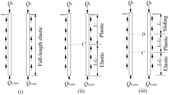 In these calculations, it was assumed that the load at annulus end Qb,ann transferred through the pile annulus (outer pile), and the load at the soil plug end Qb,plg transferred through the soil plug and then induced the internal skin friction fsi. The derivation was based on the following assumptions: (a) The material behavior of the pile shaft was assumed to be linearly elastic under vertical loading; (b) pile tip settlement was only induced by the loads on the pile tip; (c) the soil was homogeneous. The assumptions (a) and (b) are consistent of those in the previous load transfer theoretical models for solid pile [,,]. Assumption (c) was just used to simplify this analytical model.