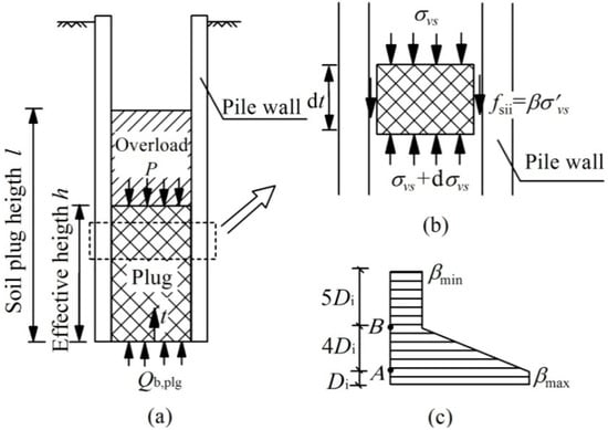 The part of the soil plug above effective height h was treated as overload. The force analysis of the soil plug unit is shown in Figure 6b, and coordinate t (the upwards distance from pile end) in Figure 6a. Hence, the basic expression for the equilibrium equation based on effective stress was as follows: