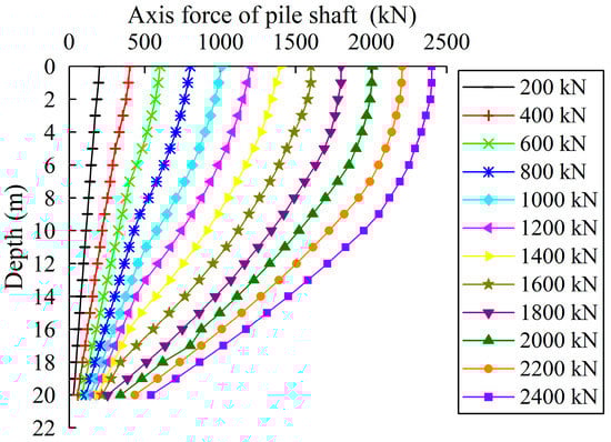 Figure 9 shows the axial force along the pile shaft under different loadings on the pile top. As we can see, at the initial stage, the bearing capacity at the pile end was not stimulated, and only properties of the pure friction pile are shown. As load increased, working load at the pile end developed gradually, and the properties of the pile were in transition from the friction pile to bearing friction pile. Moreover, at the initial stages, the distribution of axial force was roughly linear, and then transformed into a curve, whose slopes got steeper as the depth became deeper. This revealed that the friction of the lower part of the pile was greater than that of the upper part. The slope in the vicinity of the pile end changed evidently. The larger the load, the more obvious the change in slope appeared. This meant that the axial force decreased sharply, largely due to the contribution of soil plug friction.