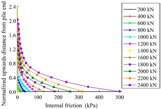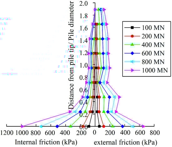 Figure 10 shows the distribution of the internal friction of pile annulus under each level of load. The distribution increased exponentially with depths. The closer it was to the pile end, the larger the friction. When the load was small, the frictional resistance provided by the soil plug was negligible. As the load increased, the frictional resistance was gradually stimulated and the effective height increased gradually as well. When the load was 2400 kN, the internal skin friction was approximately 500 kPa, which was roughly six times as large as the external skin friction in the same depth. The effective height of the soil plug was 2.03Di, which meant that the soil plug stress mainly lay close to the pile end. When the load was at its limit bearing capacity of 2150 kN, the internal skin friction at the pile end was 283 kN, which was 3.4 times as large as the external skin friction, and the effective height of the soil plug was 1.78 Di. The analysis above demonstrated that, when the working load reached the bearing capacity limit, the part of the soil plug whose friction had been developed was only within the range of two inner radiuses above the pile end. The bearing capacity of the soil plug was far from well-developed, and the soil plug end resistance depended on the development of the lower part of the soil plug, which is inconsistent with the research result of Kishida and Isemoto [].