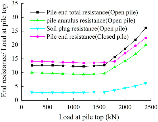 Figure 11 shows how the ratio of end resistance to the load at the pile top of two kinds of pipe piles changed with increasing load. As we can see, end resistance remained steady when the load was less than 1700 kN, and the proportion of end resistance increased gradually when the load was greater than 1700 kN. When the load reached 2400 kN, the load at the open-ended pipe pile top shared by the pile annulus and soil plug accounted for 20.1% and 6.1%, respectively. In comparison, the ratio of end-resistance to the load for the closed-ended pipe pile was 22.6%, slightly less than that of the open-ended one. This was because the squeezing effect of the closed-ended pipe pile was more significant, so that the external skin friction was much greater than that of the open-ended pipe pile, which caused only part of the soil to be squeezed. Consequently, the proportion of the external skin friction of the closed-ended pile was larger.