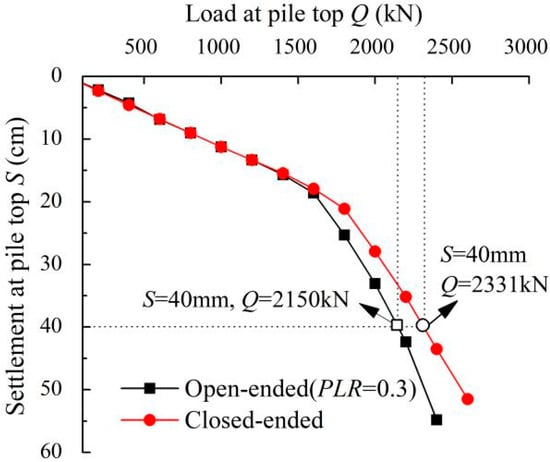 Figure 12 shows the curves of load-displacement at the pile top of the open-ended and closed-ended piles under the same conditions. The two curves were almost overlapping at the initial loading stage, and when load exceeded 1700 kN, the two curves started to diverge. At the later stage of loading, the settlement of the closed-ended pipe pile was smaller than that of the open-ended one, and the larger the loading, the more apparent the difference. The load values of the closed-ended and open-ended pipe piles at the displacement level of 40 mm were 2331 kN and 2150 kN, respectively, with the former being 8% greater than the latter.