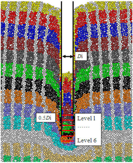 The discrete element method (DEM) has been developed and has recently been used in geotechnical engineering. The DEM is based on the explicit numerical scheme in which the interaction of particles is modelled contact-by-contact and the relative motion of the particles is modelled particle-by-particle. Therefore, the DEM makes it possible to simulate granular materials at both the micro and macro scales, and the software PFC developed by the ITASCA consulting group was applied in this study. A model open-ended pipe pile was jacked into the homogeneous sandy soil samples generated using Grid-Method []. An increased gravity field of 100 g was conducted in this simulation, mimicking the centrifuge testing conditions, resulting in a prototype pile with a diameter of 4.5 m and penetration length of 50 m. Each pile wall was made of two columns of overlapped particles with a radius of 1.125 mm, so as to measure the external and inner friction separately. Table 1 shows the discrete element method model input parameters. The view of system just after installation is plotted in Figure 13, and the final length of the soil plugs was 0.24 m (PLR = 0.48). The sand particles were made of disks with a maximum diameter of 7.05 mm, a minimum diameter of 4.5 mm, an average grain diameter d50 = 5.85 mm and uniformity coefficient cu = d60/d10 = 1.26. The ratio of dpile/d50 was around 8 in this model, which is close to the values suggested by Vallejo and Lobo-Guerrero [], ensuring the efficiency and accuracy of this numerical modelling.