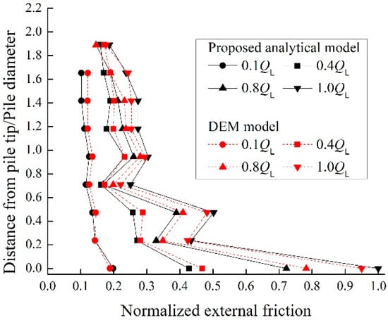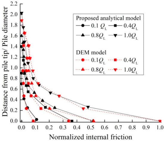 After installation of the pile, the increasing vertical static loads were applied on the pile top until they reached the limited load (i.e., the pile top settlement reached to 10% of the pile outer diameter De). It was noted that the residual stresses induced by the installation were ignored in this simulation. In order to compare the external and internal friction more clearly, only the section of 2.0 Di above the pile tip were considered, as shown in Figure 14. It was clear that both the internal and external skin frictions were gradually stimulated with increasing loads. The maximum internal skin friction at the pile end was 981 kPa, which was 50% larger than the maximum external skin friction. This ratio was close to the measurements in the piles with lower plugging degree [,], but was much lower than that in the above calculation example (Section 3), probably due to its higher plugging degree. Meanwhile, the internal skin friction decayed sharply with the distance from the pile tip, decreasing to less than the corresponding external skin friction above 0.4 Di. The effective height of the soil plug was 1.89 Di at the limited load, which was closed to the value of 1.78 Di obtained from the calculated example (Figure 10) and the observations from the model test []. The internal frictions and external frictions in this DEM model were normalized by the maximum internal friction at the pile end under limited load QL, with a normalized distance from the pile end, which are plotted in Figure 15, Figure 16, Figure 17 and Figure 18. It was clear that these distributions were close to the results from the analytical model.