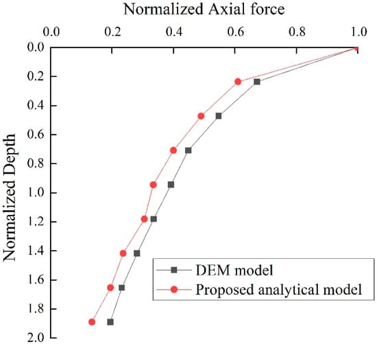The axial force-depth from the analytical method and DEM model.