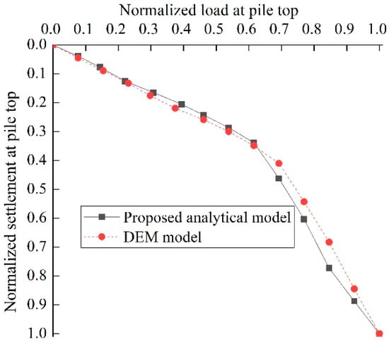 The load at pile top versus the settlement from the analytical method and DEM model.
