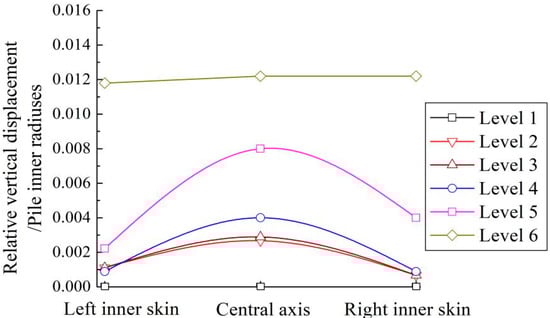 The relative vertical displacements of sand particles from the pile tip at the limited load at six levels (at 0.5 Di intervals) inside the pile at the limited load are plotted in Figure 19. It was clear that the particles at level 2–6 moved upwards relative to the pile tip, partially at and beneath the pile tip level. This indicated that the soils beneath the pile tip still further intruded into the pipe with the pile tip settlement. Even so, as the particles at levels 1 remained relatively static, the soil plug length kept constant during the whole loading process, indicating that the soil plug was compacted. This phenomenon further confirmed that the effective height of the soil plug was the portion where the soil particles moved relative to pile wall. In addition, the particles around the central axis experienced larger displacements than the adjacent pile inner skin, thus implying an “initiative arch” formed under the restriction of internal skin friction during vertical loading.