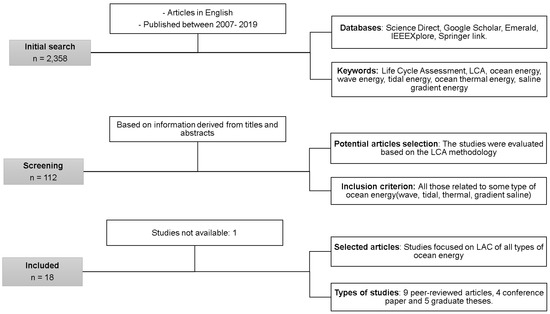 To achieve the objective of this review, a systematic analysis was undertaken to identify and assess all LCA studies of ocean energy systems reported in literature from 2007 to 2019. The methodology for this literature search is shown in Figure 2, and includes the three-step practical screening conducted. This review was based on the standardized technique for assessing and reporting reviews of LCA by Zumsteg et al. [36]. First, two inclusion criteria were applied: Articles must be in English and must have been published between 2007–2019 (since during the last decade there has been reflected a major attention to the environmental impact assessment generated by these new technologies). The relevant literature was searched in different search engines of major publishers (Science Direct, Springer link, Emerald, IEEEXplore). The search engine Google Scholar was used to include studies that were not published in journals. Searches were started with various keywords in an iterative process, such as: Life cycle assessment and its synonyms (LCA and life cycle analysis), ocean energy, wave energy, tidal energy, thermal energy and saline gradient. In the initial search, 2358 studies were identified considering the diverse keywords for our systematic review. A second screening was based on information derived from titles and abstracts, in this stage 112 relevant studies were identified. In the final count, potential articles selection was focused on the LCA methodology and inclusion criterion (all types of ocean energy). Lastly, the literature review involved 18 potential LCA studies of ocean energy; nine scientific papers published in international peer-reviewed journals, five post-graduate theses (four master and one bachelor’s degree) and four papers presented at conference congress. The studies considered in the present review allowed for obtaining a global environmental assessment of the ocean energy generation systems in the different stages of their life cycle that could be used to guide the research and development of these systems.