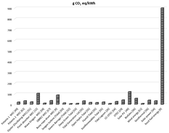 As mentioned earlier, most of the papers concentrate only on carbon emissions and embodied energy (11 of 18 published articles) (Table 1) [49,50,51,54,56]. The articles focused on these topics are in line with the current global situation regarding increased energy demand, the use of renewable energy sources, and climate change. In this context, ocean energy represents a promising worldwide transition to a low-carbon electricity system [49,57]. This section involves a thorough life cycle carbon emission assessment of the all different devices evaluated, considering the technologies of each system.