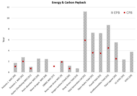 An important environmental criterion for evaluating the scope of acceptability of ocean energies is the energy payback period (EPB) which indicates the time period for renewable energy technology to produce the amount of energy that was used for manufacturing, maintenance, operation and the energy produced during the useful life of the system [9,53,54,59]. The EPB is obtained by dividing the total lifetime energy input by annual energy production [49]. EPBvalues depend mainly of annual energy production, device life, and type materials required of the manufacture stage. Additionally, another significant environmental indicator for renewable sources is carbon payback (CPB). CPB is the time period in which the CO2 emissions are retrieved from renewable ocean devices. The CPB is calculated as by dividing the total embodied carbon by the annual carbon avoided by the use of the ocean energy technologies [9,49]. Figure 6 shows the comparison of energy and carbon paybacks for the different ocean energy technologies evaluated, including: Wave, tidal and thermal energy systems. At a global scale, the WEC devices have relatively less EPB and CPB than tidal converters. Additionally, the CPB of WEC is expected to be shorter than tidal energy.