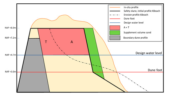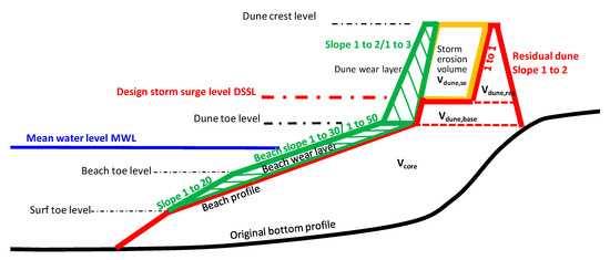 - Residual dune zone; which is the residual dune volume Vdune,res above the design storm level that must remain present after an extreme design storm (with a return period in the range of 1000 to 10,000 years);