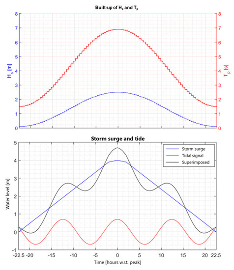 The design storm with a frequency of occurrence of 1 per 4000 years is defined (by the authority HHNK) as a storm with a duration of 45 hours and time course as given in Figure 5 and Table 2. The storm surge water level including tide starts at 0 m NAP and builds up to a maximum of +4.7 m NAP. The tidal curve is based on an M2 tide with an amplitude of 0.7 m. The design wave height (1/4000 years) varies in the range of 2.5 to 3.4 m (depth of −20 m NAP in adjacent tidal channel), depending on the location, see Table 2 [33].