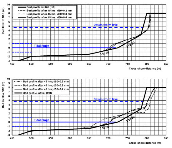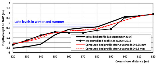 The Crosmor-model, which includes both onshore- and offshore-directed transport processes, has been used to determine the beach changes (erosion/accretion) during daily wave conditions. Firstly, the model is validated to check whether the model produces meaningful results for daily wave conditions. The validation case refers to a small sand beach at the north side of a large lake in The Netherlands [8,35,36]. The beach was made of sand with d50-value of 0.265 mm (mean value of 80 samples). Measured wave heights at a depth of 2.5 m are up to Hs = 1.2 m, mostly from west to south-west. The lake level varies between −0.2 m and −0.4 m NAP. Water level setup due to wind forces is up to 0.4 m. Wind-induced circulation currents to the east may be as large as 0.4 m/s during stormy periods. The measured wave climate is schematized to 6 wave classes for model input. Figure 6 shows the initial beach profile in the middle of the beach and computed bed profiles after 2 years for d50 = 0.25 and 0.3 mm (250 and 300 μm). The measured erosion above −1 m NAP is about 20 m3/m after two years. The computed erosion of about 10 m3/m after two years is less than the measured value, but it is a fairly good result given the fact that some of the measured erosion is caused by longshore transport processes which are not taken into account by the model. The Briar Skill Score (BSS) of the predicted profiles in comparison to the measured profiles is about 0.8 which means a good prediction (BSS in the range of 0.6–0.8 [29].