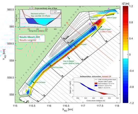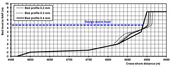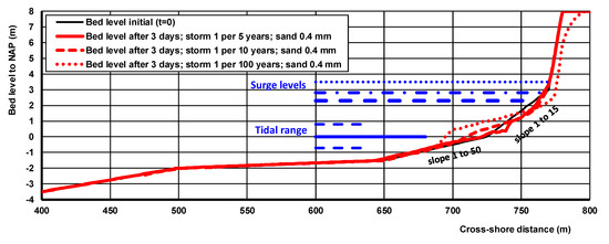 The Xbeach2dh-model [37] has been run for a period of five years including 15 storms with return periods up 1 per 10 years. The predicted erosion volumes are about 3 to 5 m3/m/year at transect 10, about 5 to 10 m3/m/year at transect 15 and 10 to 15 m3/m/year at transect 25 for sand of 0.4 mm (Figure 9 and Table 3). The slope of the upper beach becomes slightly steeper. The storm-related beach erosion values on the time scale of five years based on Xbeach2dh are larger (factor 2 to 3) than those of the Crosmor-model as the longshore currents due to tidal and wave breaking effects are better accounted for. Some of the eroded sand may be returned to the upper beach zone during long (summer) periods with low waves resulting in onshore sand transport, which is not included in the Xbeach2dh-model.