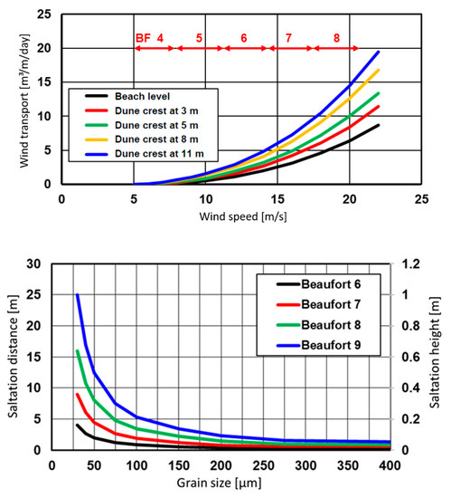 Figure 12 (lower panel) shows the saltation length and height of the sand grains for various wind strength classes based on the work of Han et al. 2011 [40] and Kok et al. 2012 [38]. This information was used to determine the height and locations of wind screens to prevent the transportation of sand to the hinterland as much as possible. For example, very fine sediments of 20 to 30 µm have a saltation height of 1 m and a saltation distance of about 25 m for wind speed of Beaufort 9.