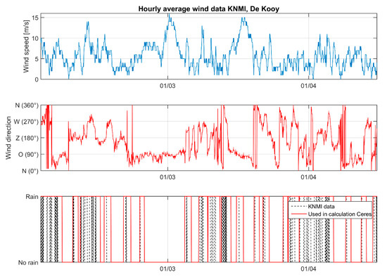 Wind speed, direction and precipitation at weather station De Kooy, The Netherlands.