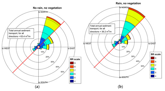 Aeolian sand transport at beach; excluding precipitation (a) and including precipitation (b); beach position is indicated by the straight line from south-west to north–east.