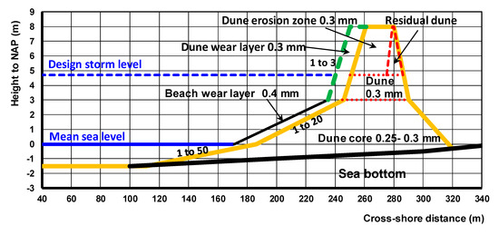 Future climate change with increased sea levels and more frequent storms is predicted to increase the vulnerability of coastal communities to coastal flooding. Traditionally, hard engineering structures such as seawalls and sea dikes have been used to protect coastal areas and communities against flooding and erosion. Hard solutions are, however, not very flexible and the financial costs of adaptation are significant, while the ecological sustainability of these solutions is not very high. Therefore, soft nature-based flood protection systems which is the subject of this paper, have recently received considerable attention [1,2,3,4]. A sandy solution in the form of an artificial dike/dune can offer a high level of protection and at the same time has a more natural appearance and higher ecological values. However, a basic problem of soft engineering solutions is the permanent maintenance efforts in the form of shore nourishments to counteract local erosion due to tide/wave-driven currents in combination with breaking weaves.