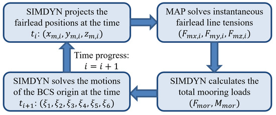 Mooring in SIMDYN is modeled using the open-source MAP++. MAP++ performs mooring analysis with quadratic modeling [27]. MAP++ ignores the inertia forces of the mooring lines and the fluid drag forces on the mooring lines [34]. Figure 2 shows how MAP++ is coupled with SIMDYN.