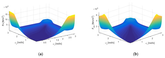 Slowly varying drift forces affect WES responses under irregular waves. Therefore, when the linear time-domain option is used, SIMDYN calculates the drift forces. In this study, the quadratic transfer functions were output from the Marine Dynamic Laboratory’s hydrodynamic analysis program, MDL-HydroD (a frequency domain program developed by our research group). Details on how quadratic transfer functions (QTFs) are evaluated can be found in previous work [35,36]. Figure 3 show sub-harmonic force quadratic transfer functions for surge and pitch.