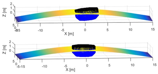 For wave frequency component , is the wave height, is the frequency, is the wave number, is the water depth, and is the total number of wave frequencies. The linear incident wave potential is not defined for the points above the mean water line . SIMDYN employs Wheeler stretching to extrapolate the incident and hydrostatic pressure profiles to provide an expression for pressure inside the incident wave crest [37,38]. Mathematically, this can be considered as scaling the z-coordinate to compute pressure up to instantaneous free surface elevation (measured from the calm water plane) due to the incident wave [37,38]. The vertical coordinate is modified to through Wheeler stretching: