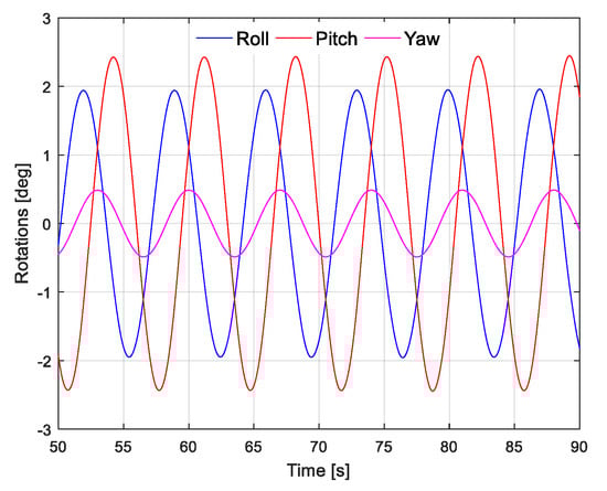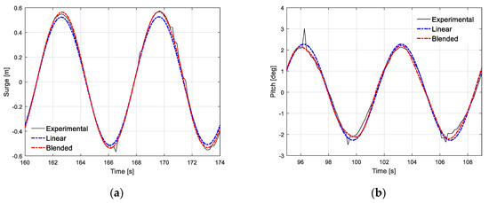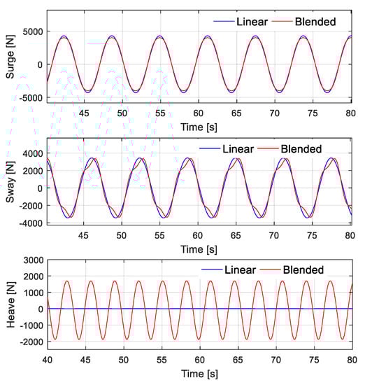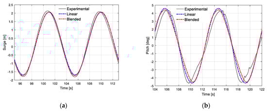 The body motions (from the linear time-domain simulation) under a regular wave of are recorded as the reference motions, . The study used a (large-amplitude) regular wave of , and the forced motions were set at five times the reference motions, . Note that the motions in the forced motion tests (except ) were not simulated but were specified (as input time series). This is quite a harsh condition (large wave and motions) for the FPS; therefore, nonlinear effects could be observed clearly.