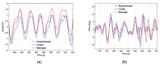 Similarly, the time-domain results of the selected irregular cases were compared with the model tests. Typical time series are plotted in Figure 18 and Figure 19.