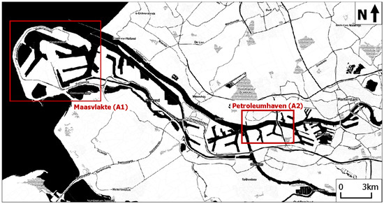 This risk assessment methodology for ports should be built for each port where it is applied. In this research, two areas from the Port of Rotterdam were chosen, and, because of their differences, the methodology will be adapted consequently for each of them. These areas are the Maasvlakte (A1), with large container terminals and big vessels, and the Petroleumhaven (A2), which resembles an inland or river port, and they are shown in Figure 3.