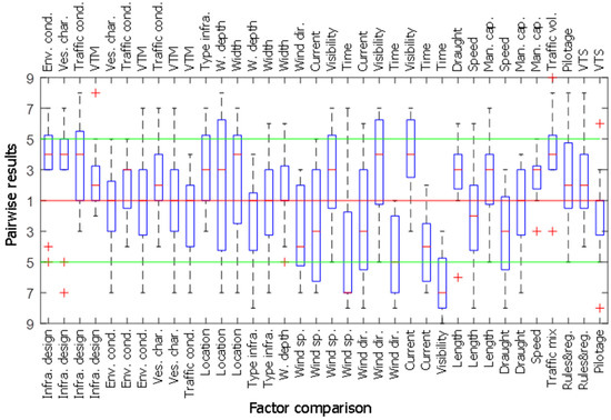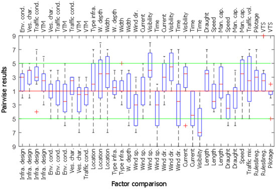 Figure 4 and Figure 5 show the results for the pairwise comparisons for the questions in each main criteria group for both port areas. For several questions, there is a clear preference for one of the criteria, while in others, the answers are close to 1, which means that the contribution to risk for both factors is considered to be equal. The answers also show that the perception changes a lot within each pairwise comparison between experts, so the larger the sample, the more normalized the results will be.