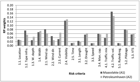 Finally, Figure 6 summarizes the resulting priorities for each criterion. It can be seen in both areas that the traffic volume and the visibility are the two criteria that most contribute to risk. The main differences between the two study areas are that, in A1, the factors type of infrastructure, wind speed, wind direction, and traffic volume have a slightly higher weight, probably due to the larger size of the vessels in the area. On the other hand, the width of the infrastructure and the current have more influence in the final weights in A2, due to the narrow basins and sharper bends connecting with the river area. The results for each criterion will be used for the NPRI calculation.
